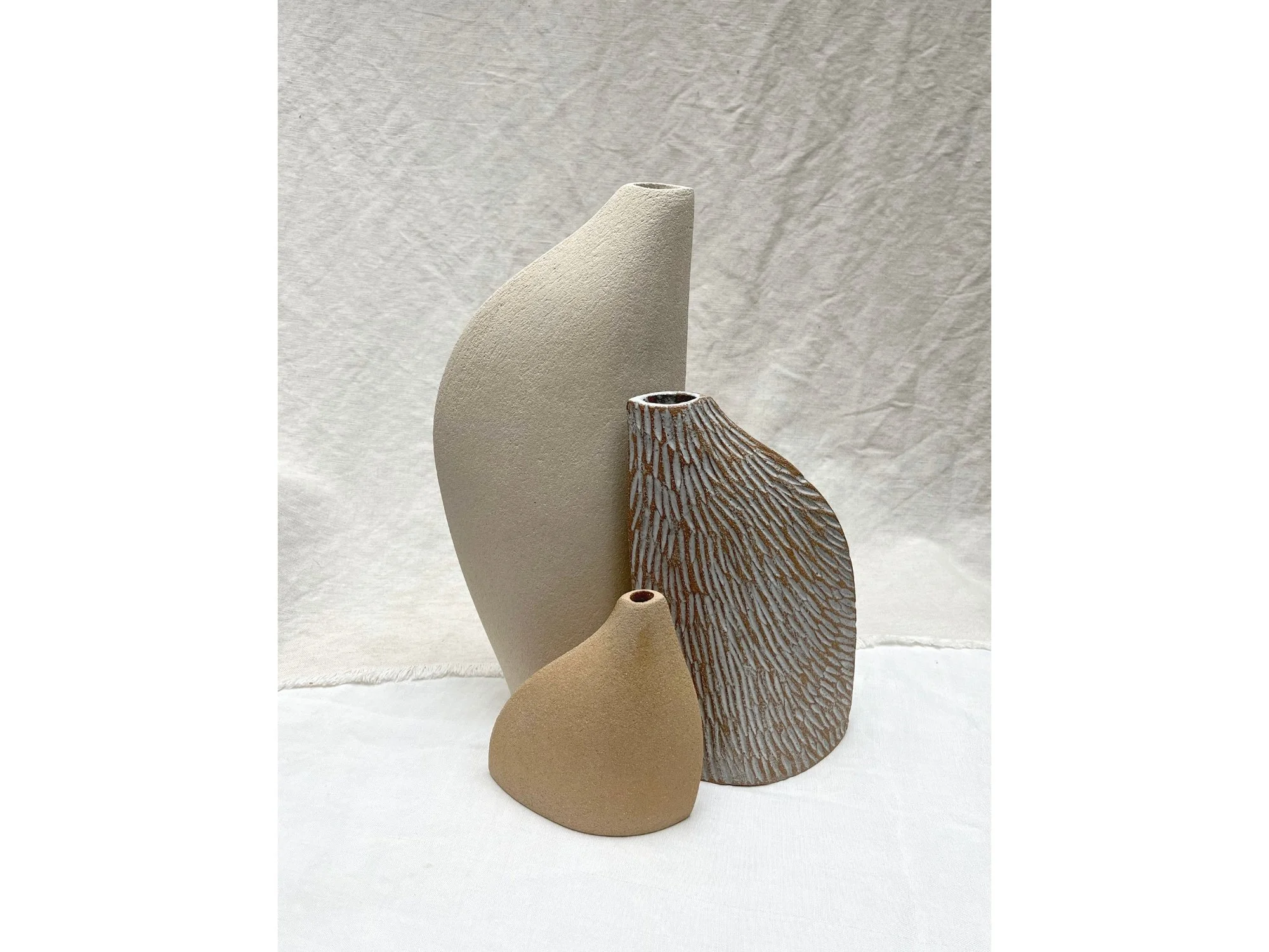 Trio de sculptures en grès blanc et grès roux émaillé façonnées à la plaque