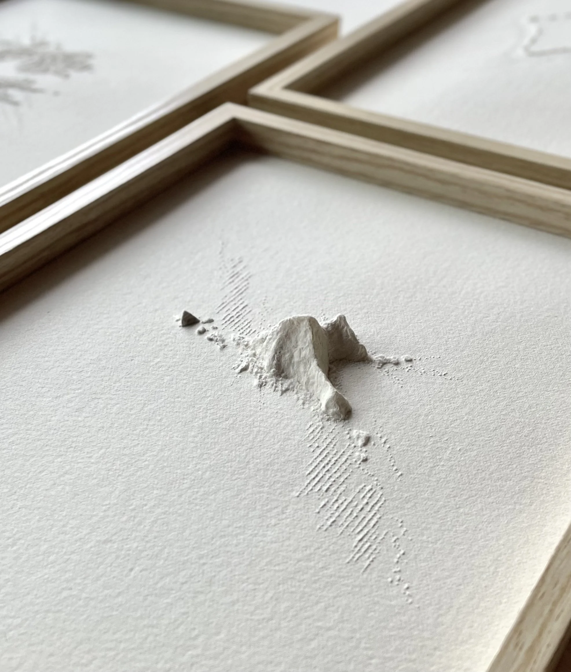 À travers ses bas-reliefs sculptés dans la matière même du papier, il trace des lignes qui semblent surgir de strates enfouies, comme les vestiges d’un monde ancien ou les souvenirs d’un rêve de géographe. Il y est question d’empreintes, de mémoire, de ce qui reste après le passage du temps.