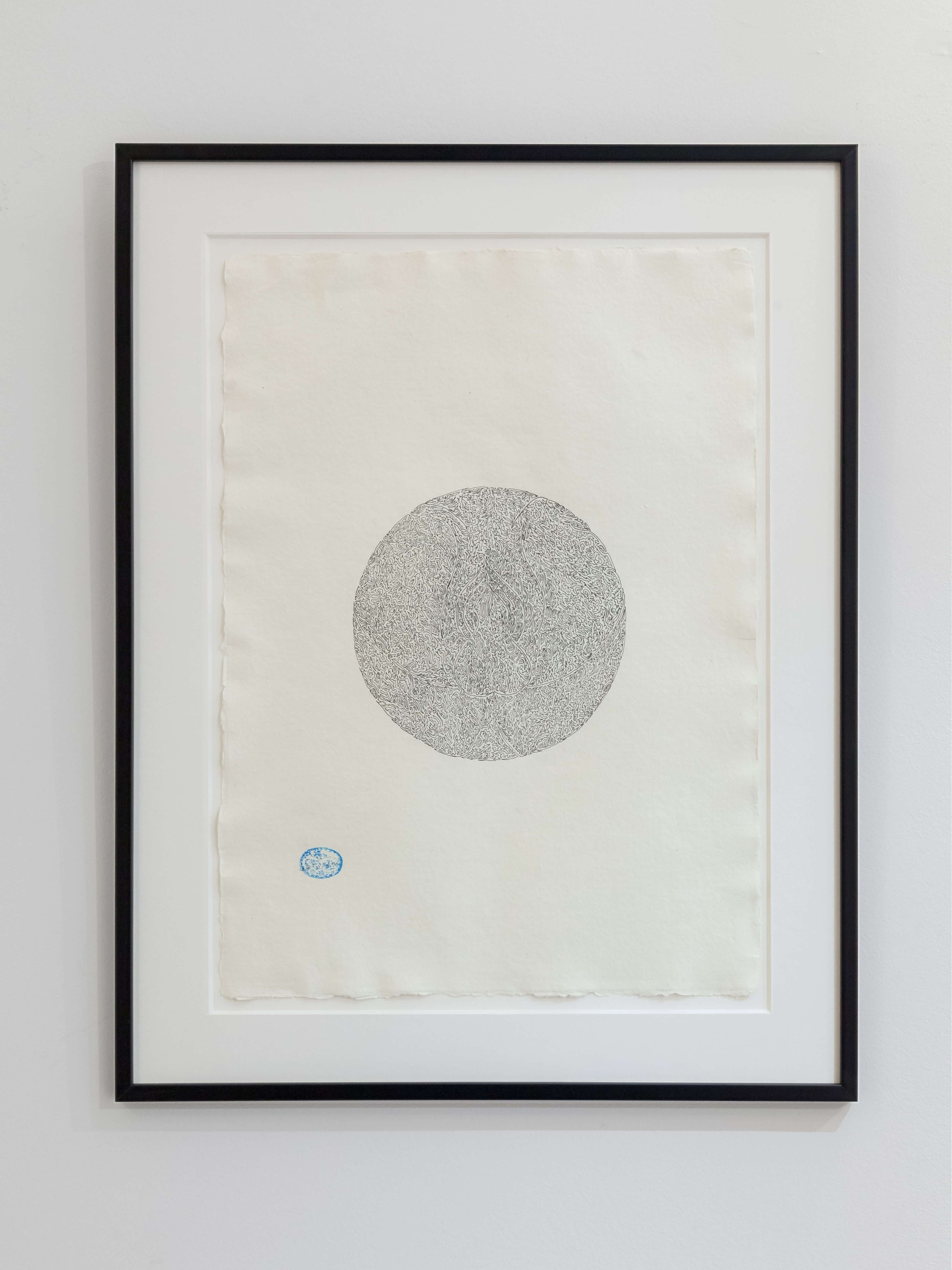 Usant de l’encre de Chine, du fusain, de la plume ou du calame, l’artiste ne recherche ni la description ni l’image immédiate. Le corps, enfoui dans la densité de l’arabesque, ne se dévoile jamais au premier regard. Tracé d’une ligne continue, sans interruption, ce corps prend forme à une certaine distance et après un certain temps car voir devient un acte temporel et comprendre demande de ralentir.