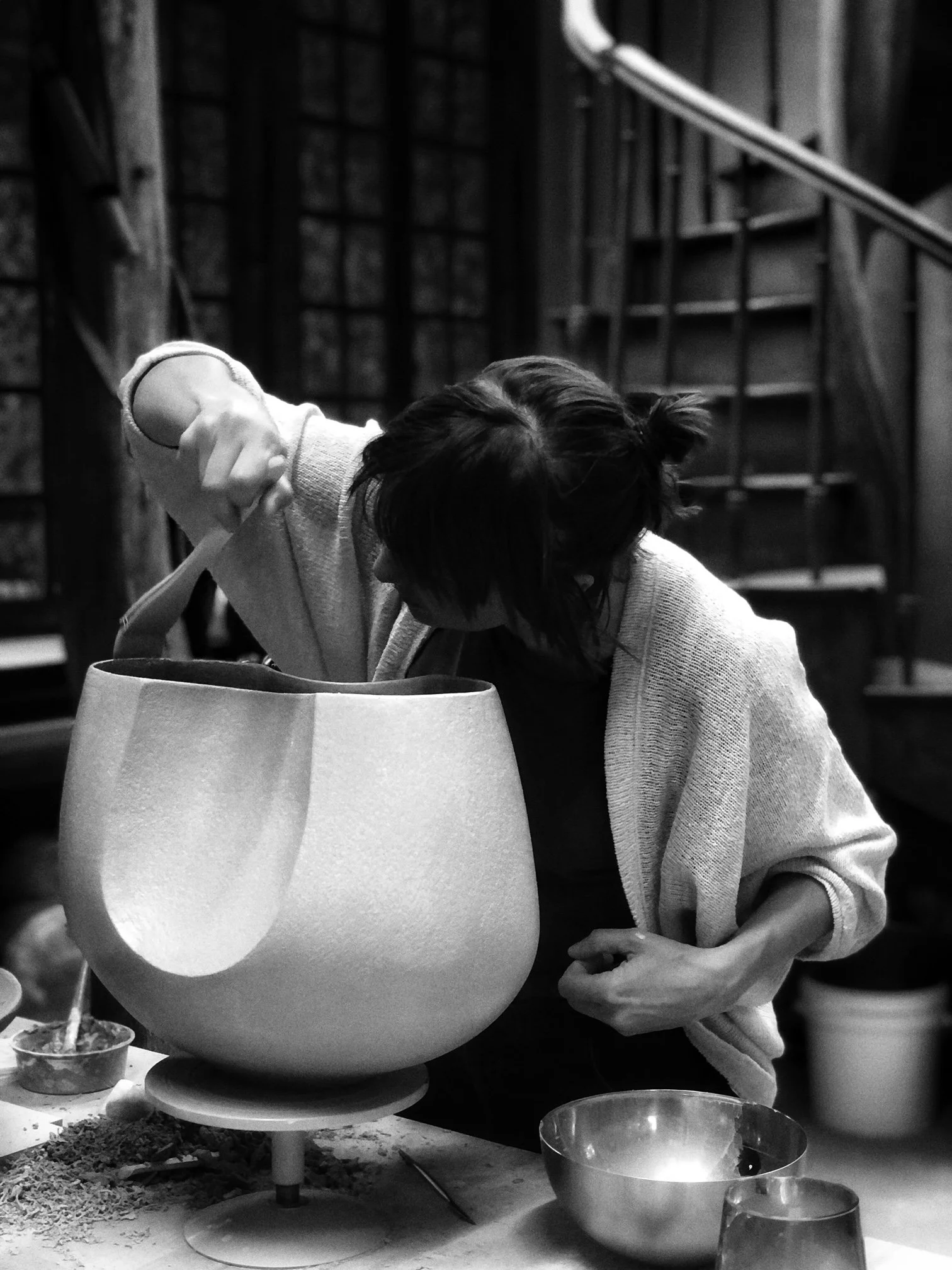 Formée auprès de céramistes français et étrangers, son apprentissage s’est nourri de vingt années d’exploration et de rencontres, notamment en Asie, où elle découvre d’autres approches du geste et de la matière.